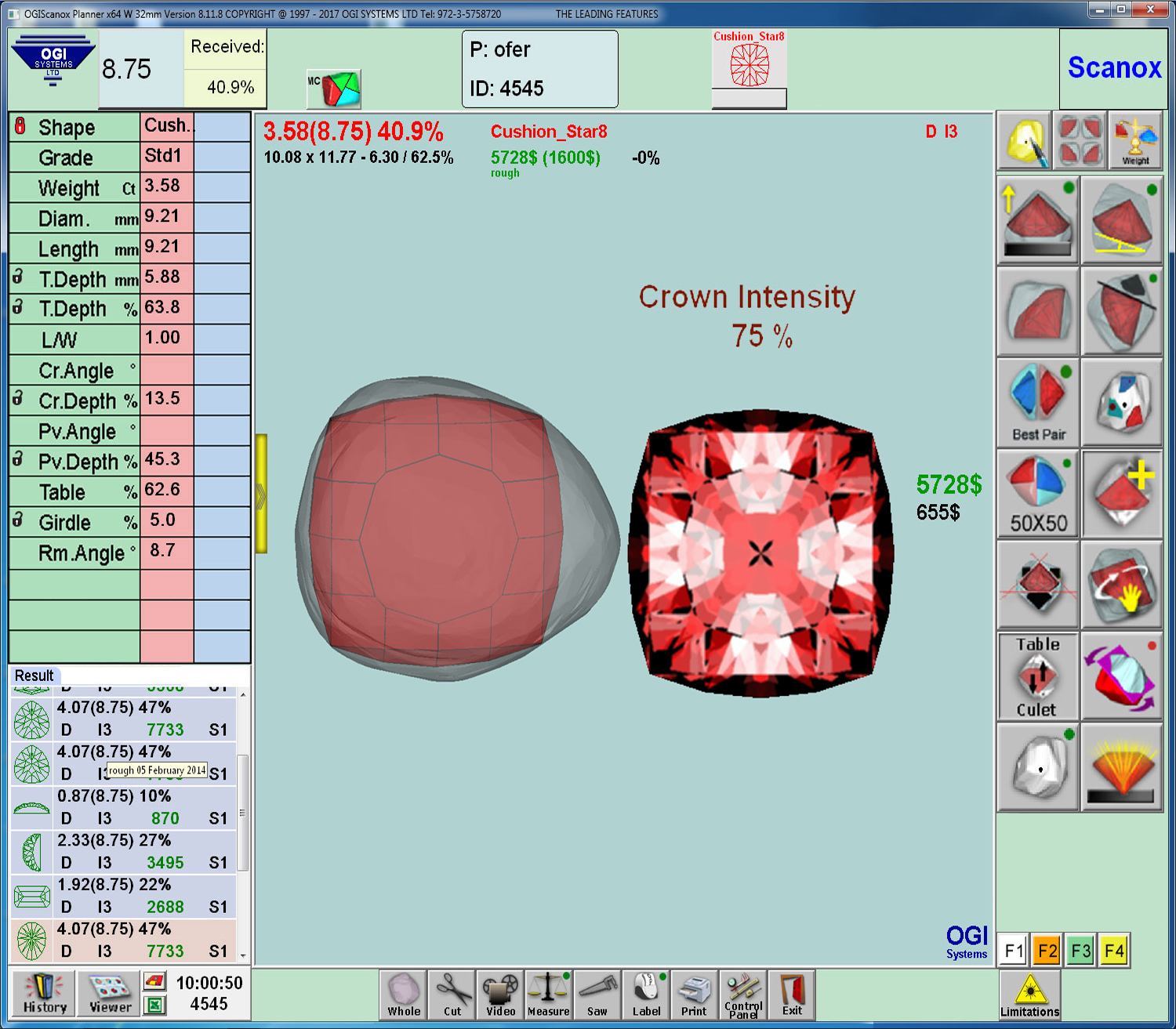 SOLICO, integrated with OGI Rough software, can allow you to cut rough stones at the middle or to get the best 50/50 pair rough stones or just table cut to make one single polish stone according to user's price list to get best value. SOLICO can cut any facets, table cutting, blocking, bruting and create any 3D model shape.