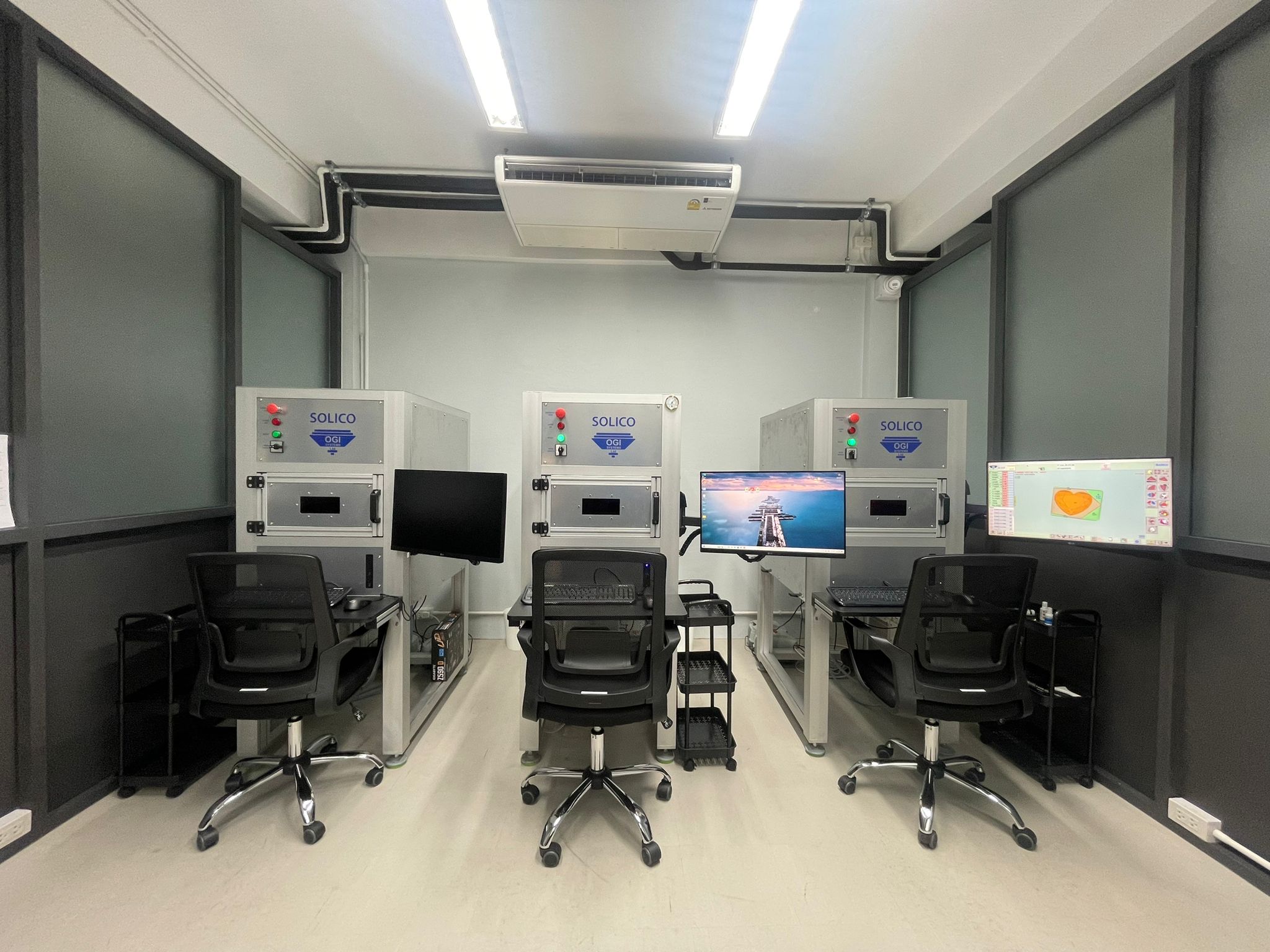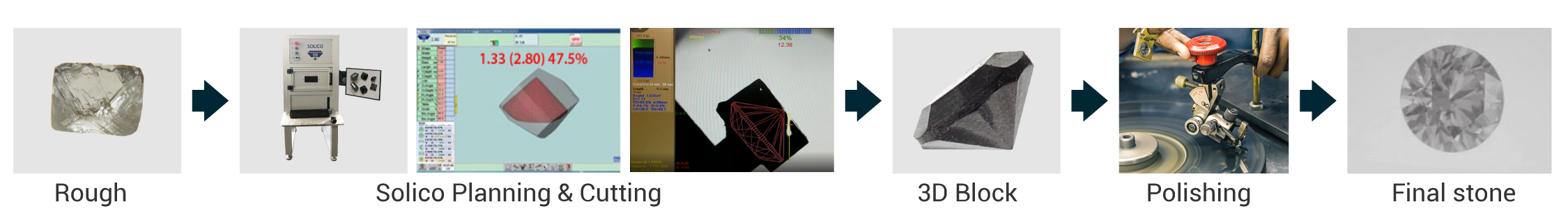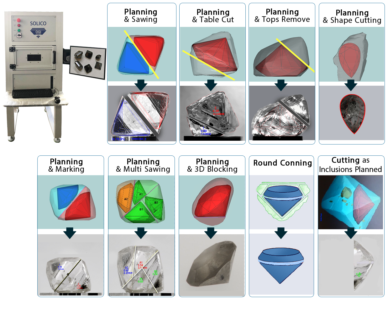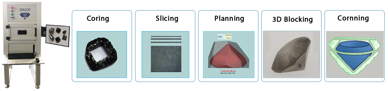 SOLICO has 5 Axis ( X,Y,Z and 2 rotations) , a measuring device to create 3D mapping of rough stone (Scanner) and allocate the best polish shape plan (Optimizer) and executing 3D process (laser).