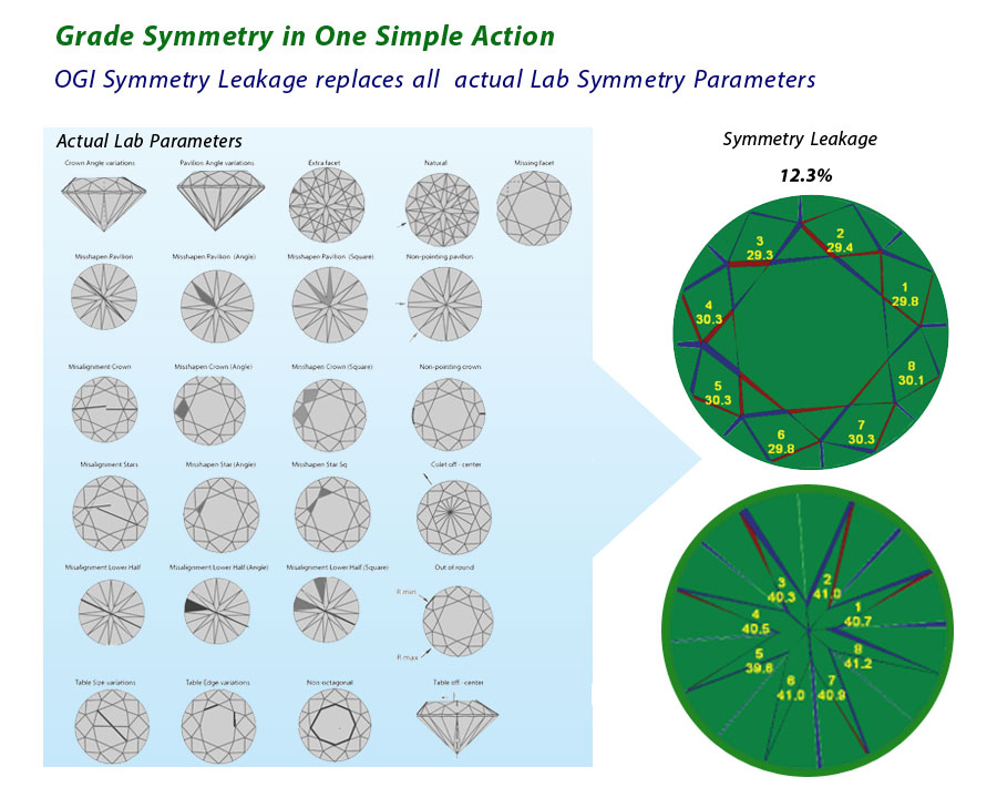 Recently OGI Systems Group unveiled Symmetry Leakage, an advanced technology for grading 3D diamond symmetry. Symmetry leakage analyzes symmetry based on 3D ideal diamond measurements against realistic internal fractions. It can predict the absolute symmetry leakage in the diamond. This software is the most advanced of its kind and will bring revolutionary change to the method of analyzing diamond symmetry. Until now, diamond symmetry was based on two-dimensional analysis including diamond edges, and matching facets and alignment. The new technology will allow simple and accurate three-dimensional analysis and grading symmetry of a diamond. The system will also give the leakage symmetry in a percentage measurement. The new method enables scanning and analyzing 8 times faster than any other method or system that exists today. Within 18 seconds, you receive one clear image showing the symmetry leakage of the stone and including the many parameters (at least 25 symmetry parameters) that build the stone's symmetry. This innovative technology system will improve the efficiency in the way that gem labs operate when it comes to grading diamond symmetry. It will significantly reduce the amount of time that a customer's stone needs to remain in the laboratory offices.